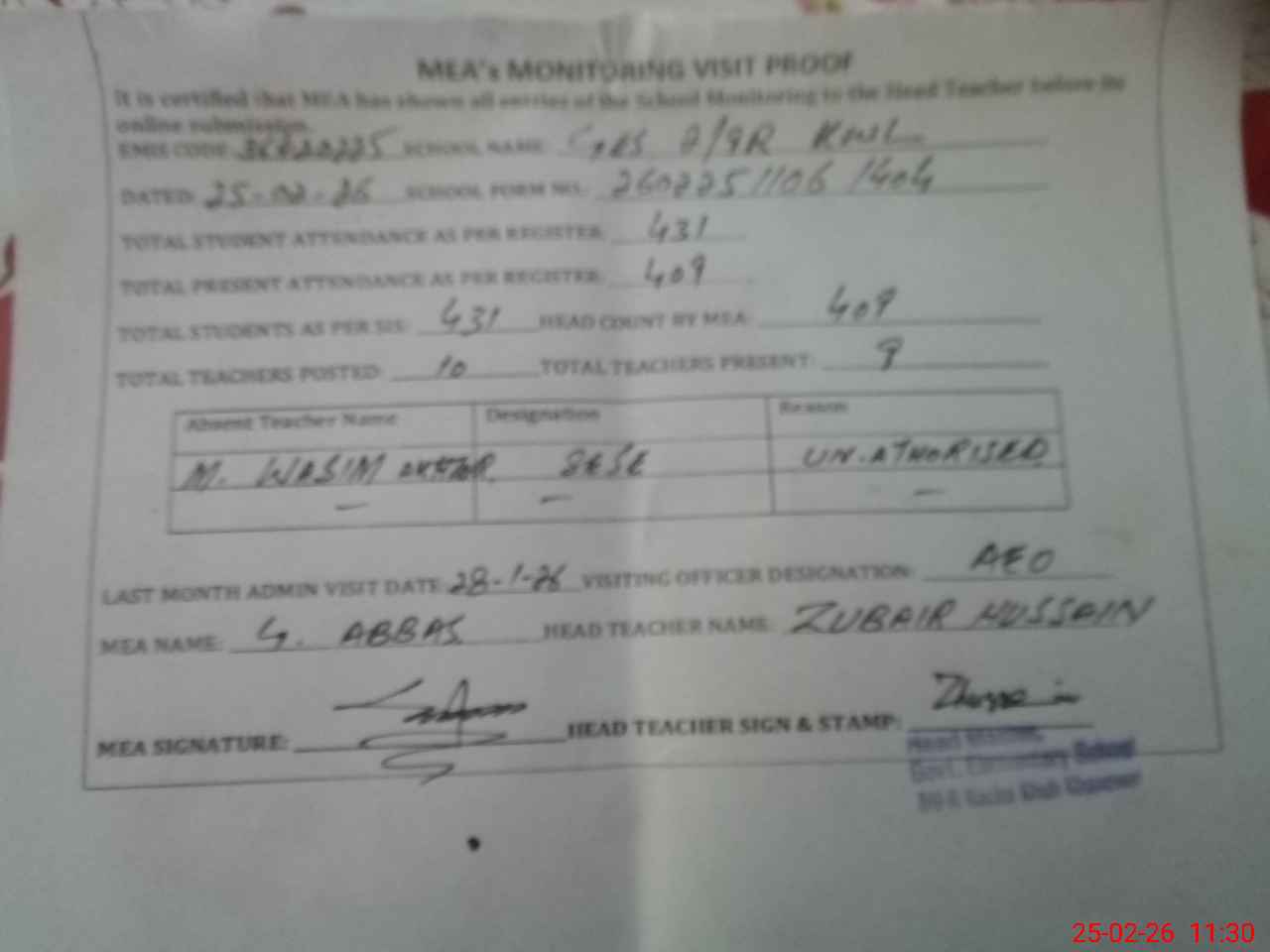 | Attendance Register | Head Teacher | MEA with School | Visit Proof |