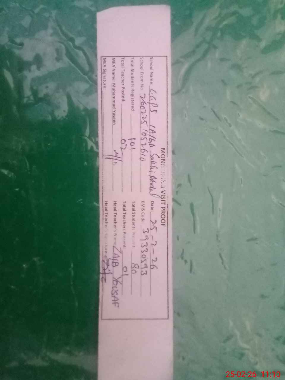 | Attendance Register | Head Teacher | MEA with School | Visit Proof |