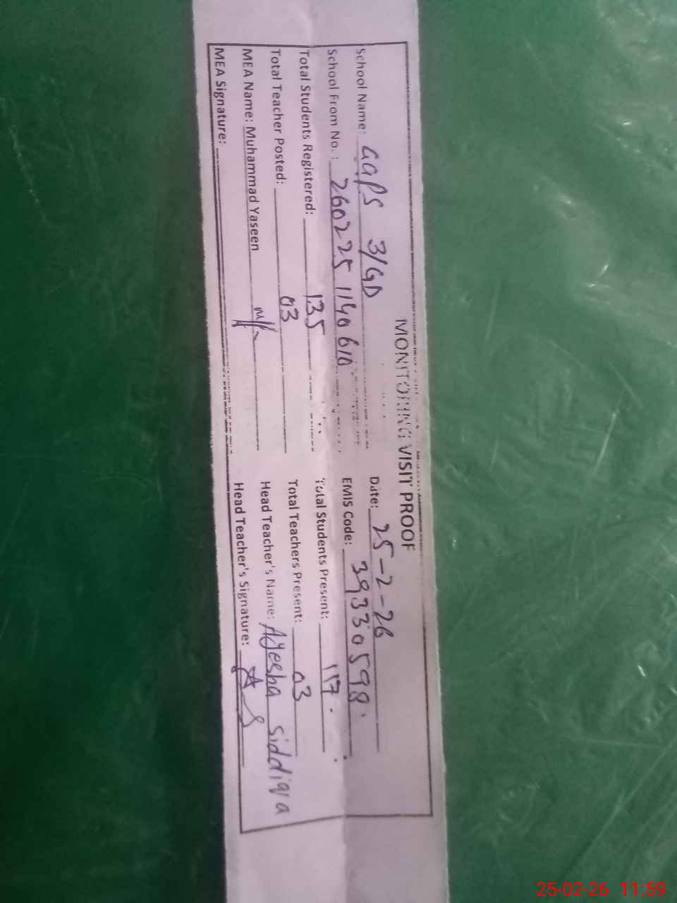 | Attendance Register | Head Teacher | MEA with School | Visit Proof |
