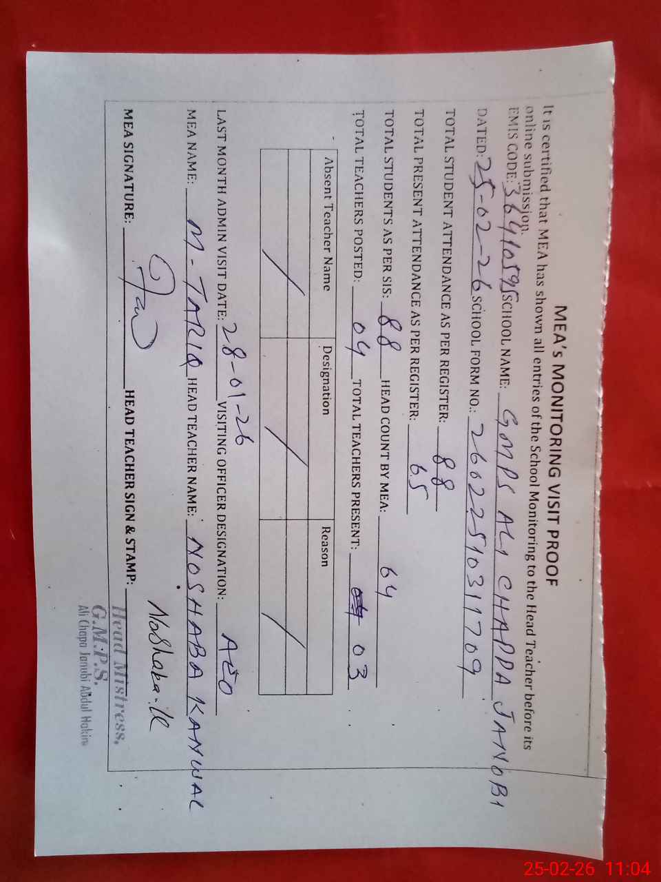 | Attendance Register | Head Teacher | MEA with School | Visit Proof |