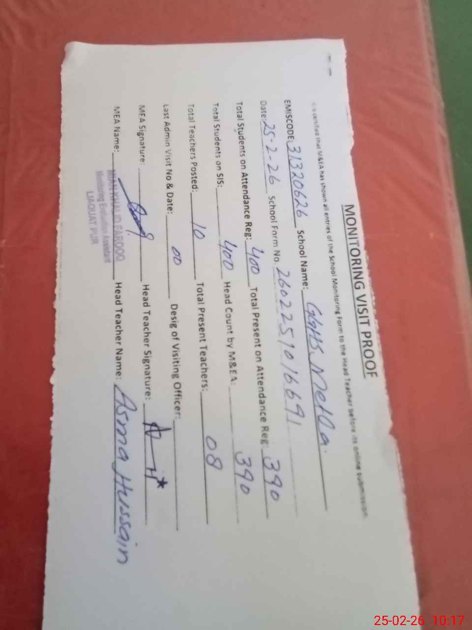 | Attendance Register | Head Teacher | MEA with School | Visit Proof |