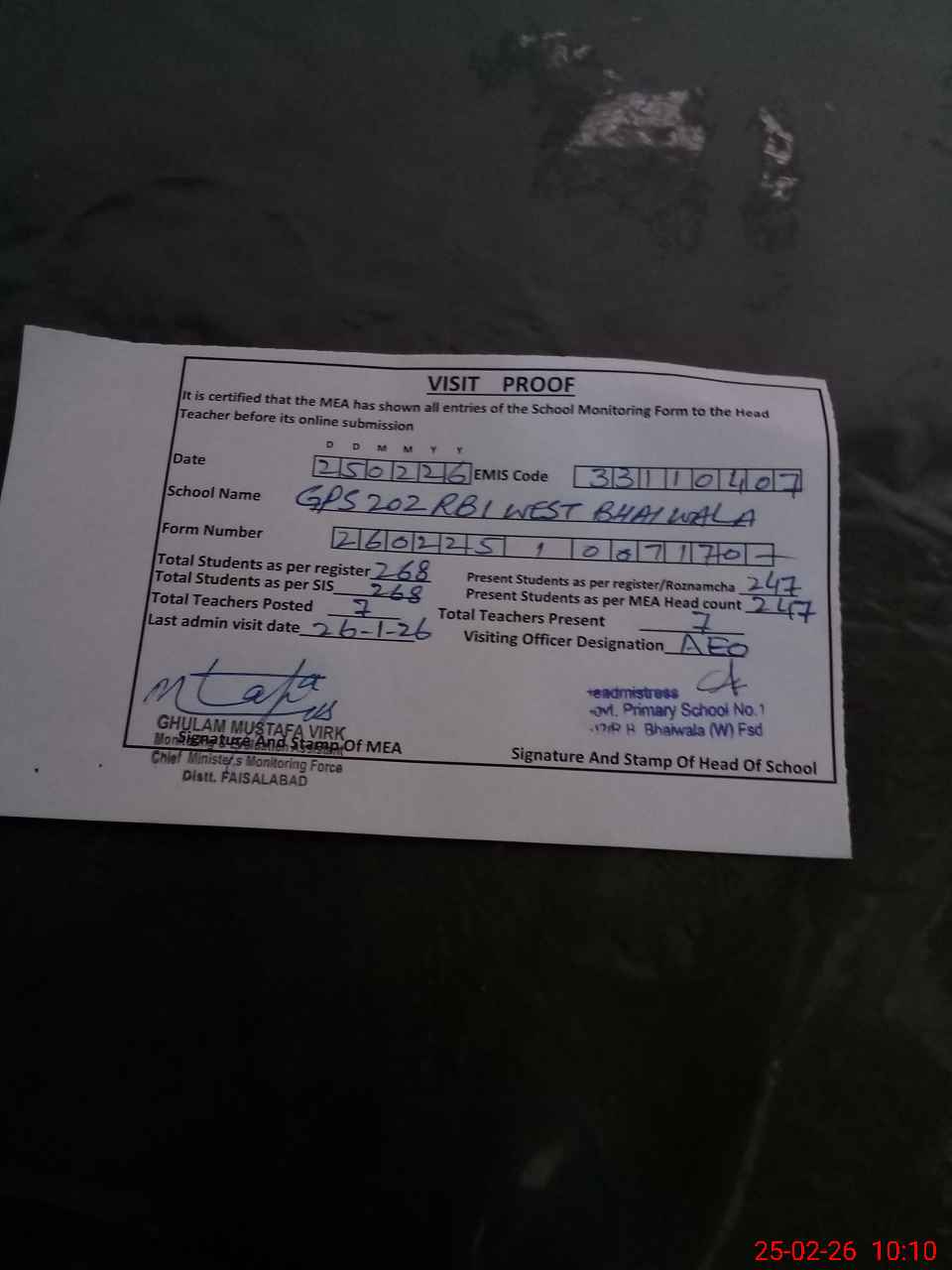 | Attendance Register | Head Teacher | MEA with School | Visit Proof |