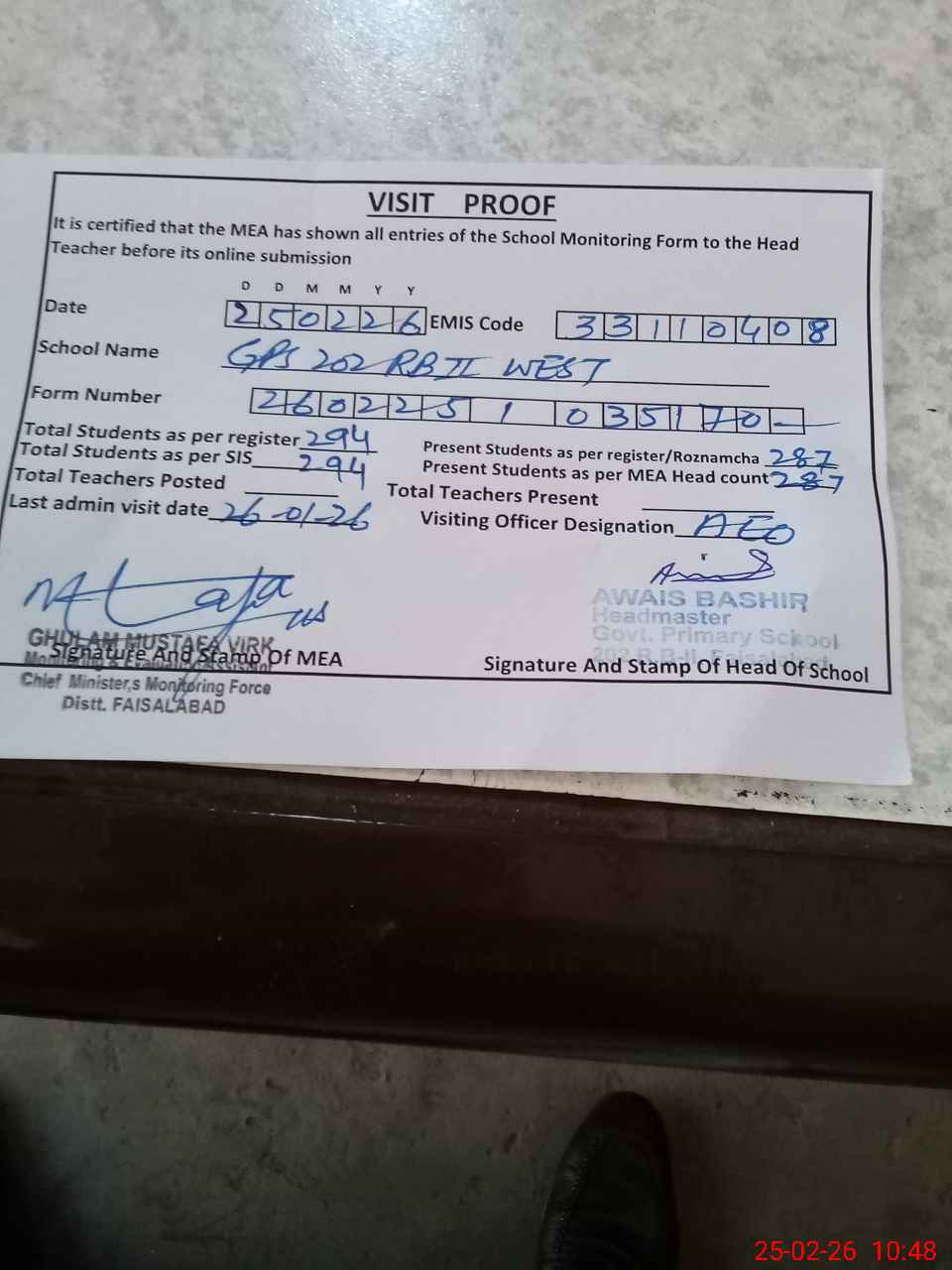 | Attendance Register | Head Teacher | MEA with School | Visit Proof |