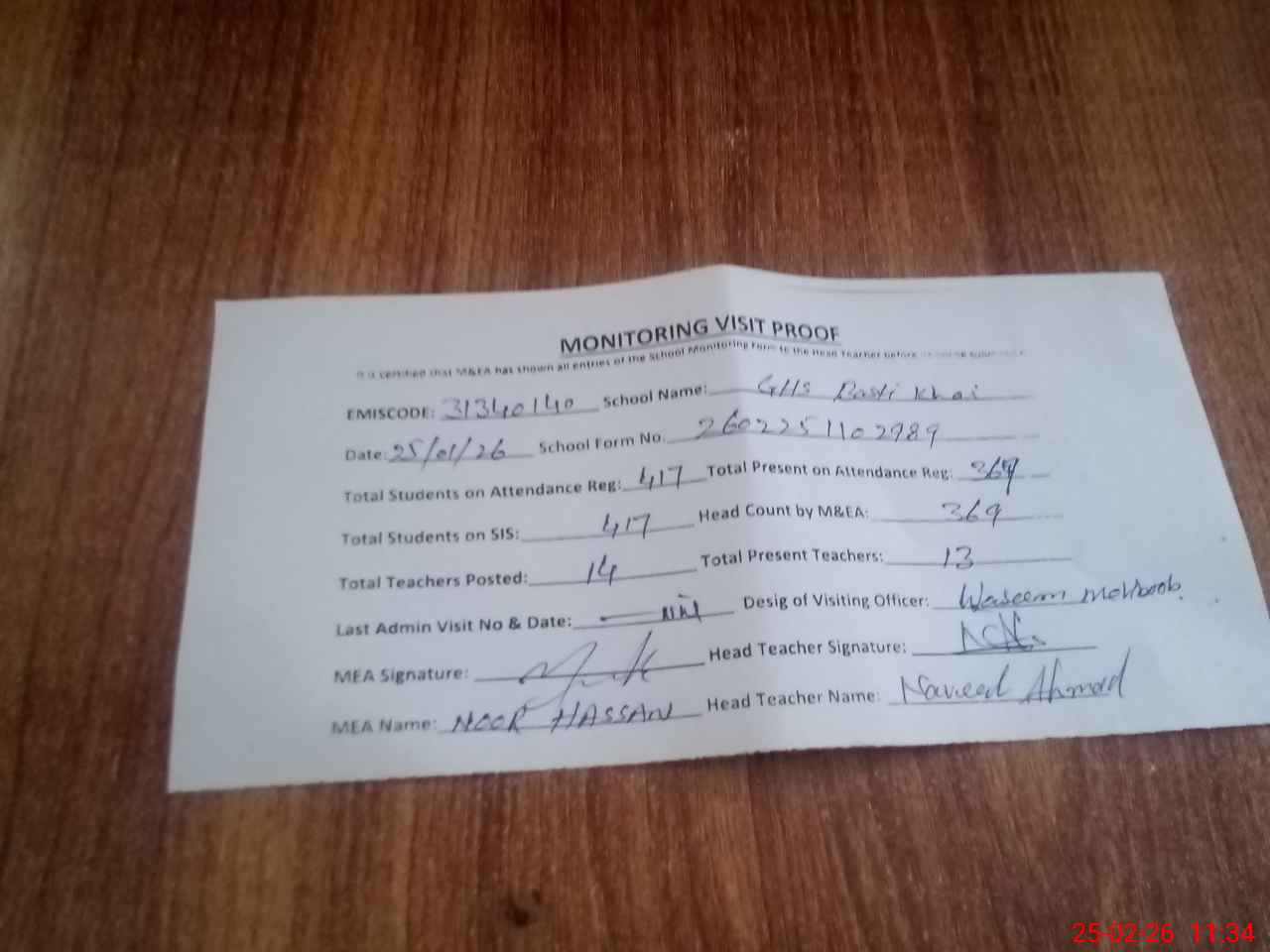 | Attendance Register | Head Teacher | MEA with School | Visit Proof |