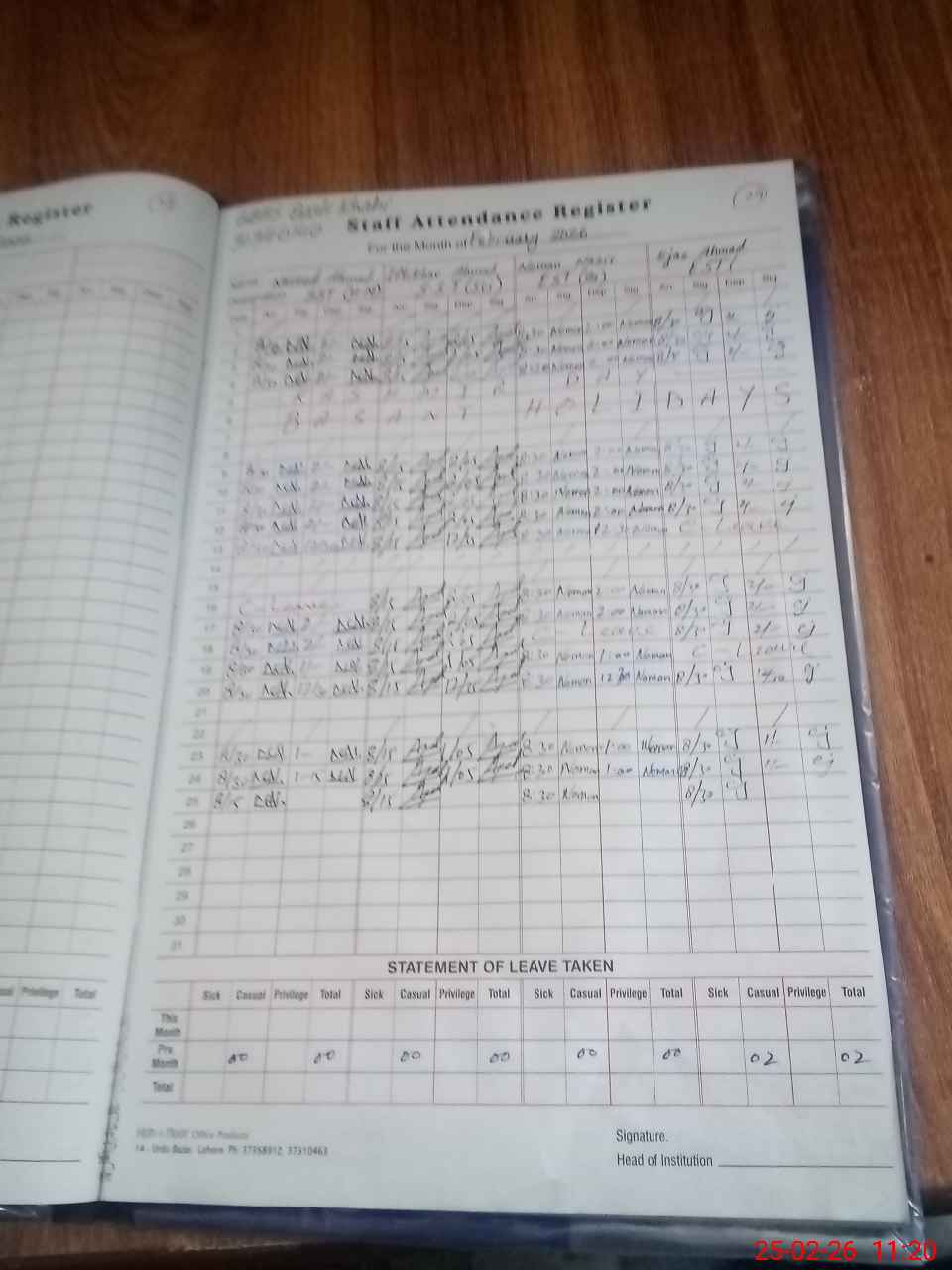 | CNIC | Full Name | Designation | R/C | Absence During Last Calender Month |