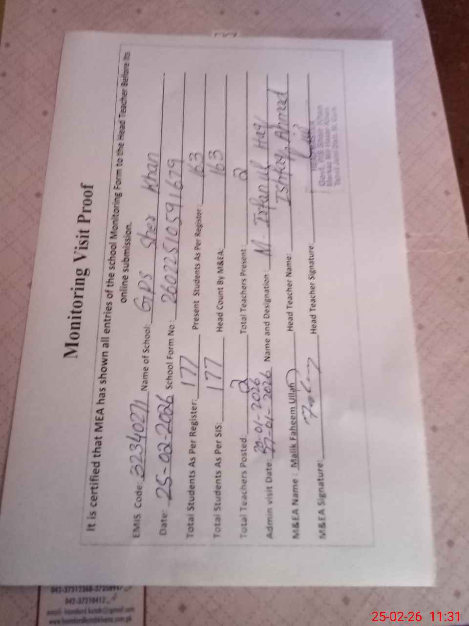 | Attendance Register | Head Teacher | MEA with School | Visit Proof |