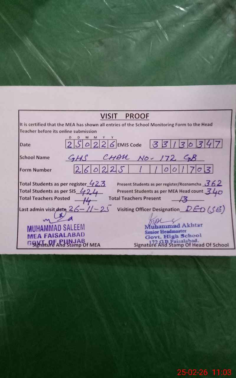 | EMIS Code: 33130347 | Name of School: GHS CHAK 172 GB SAMUNDRI FSD | |||