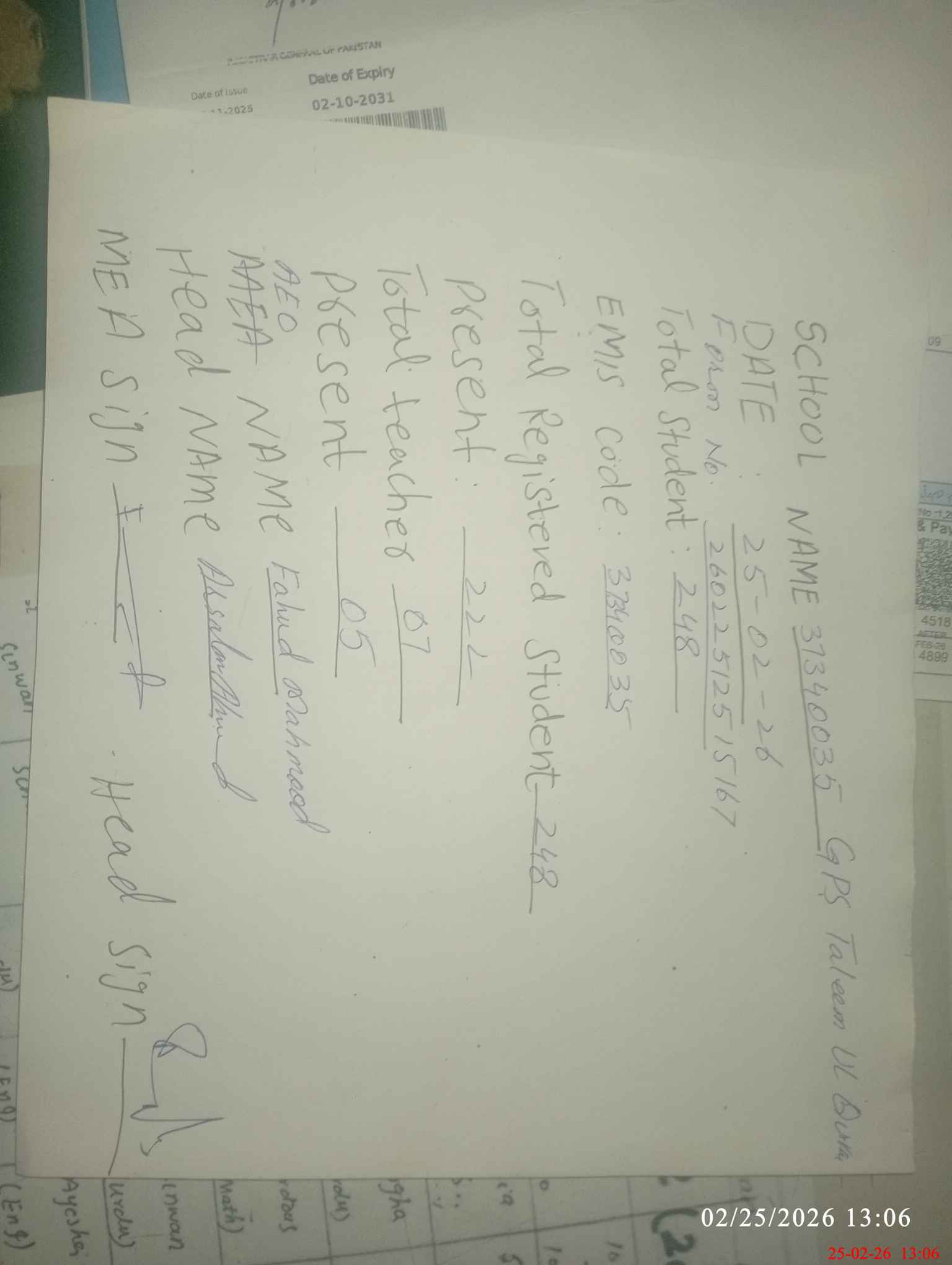 | EMIS Code: 37340035 | Name of School: GPS TALEEM-UL-QURAN | |||