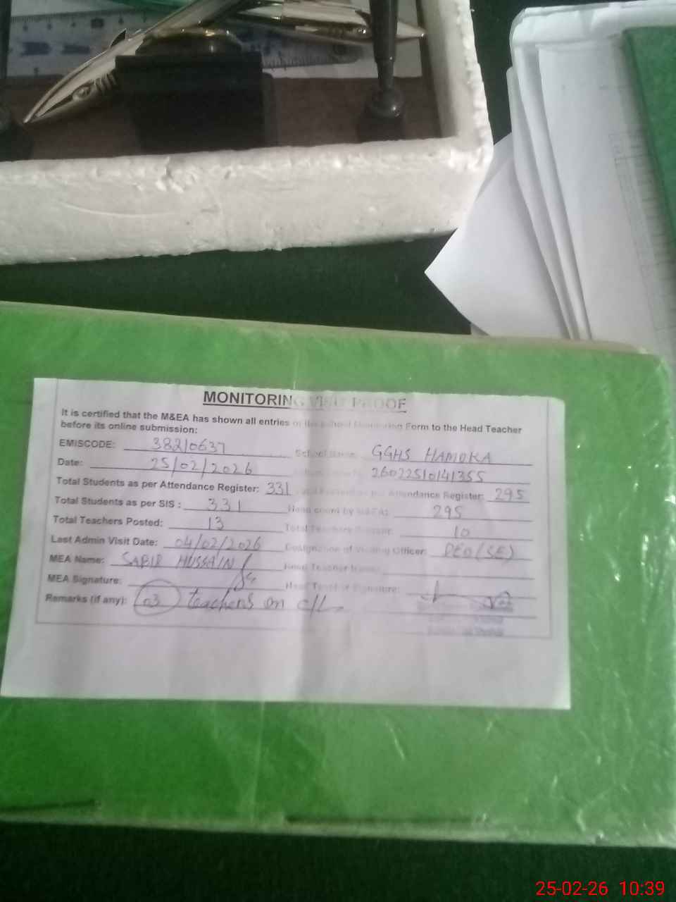 | Remarks (Use Separate Page if Required): no teacher absent total students on register 331 total students on SiS 331 last admin visit by DEO SE on 04 Feb 2026 | |||||