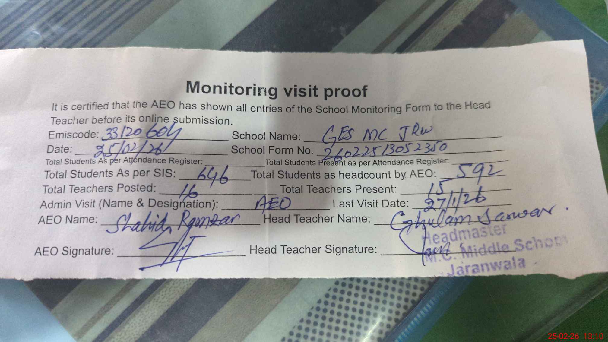| EMIS Code: 33120604 | Name of School: GES MC JARANWALA | |||