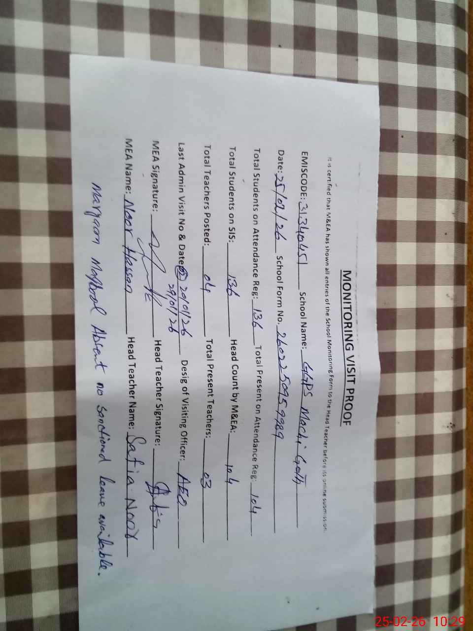 | Attendance Register | Head Teacher | MEA with School | Visit Proof |