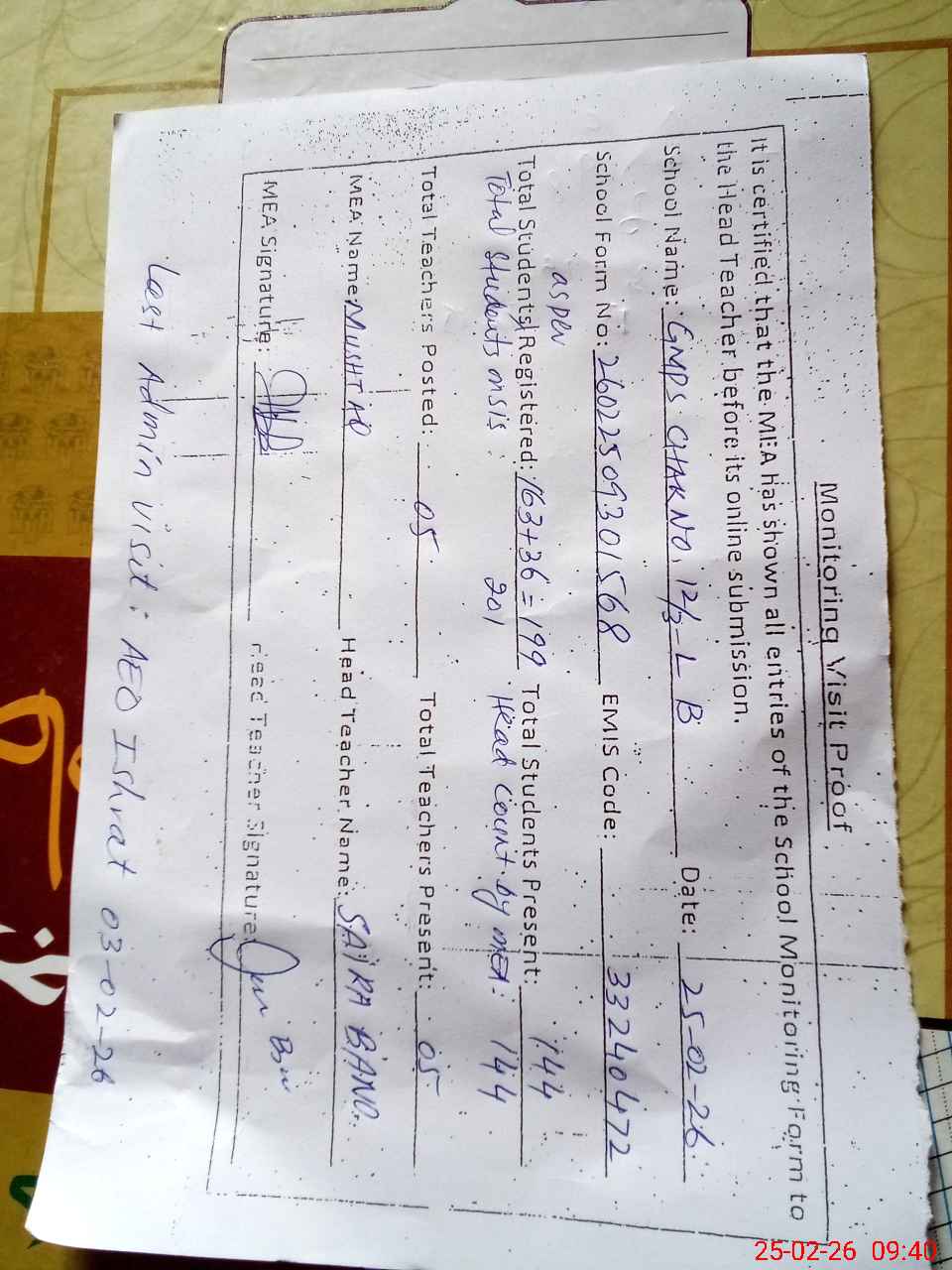 | EMIS Code: 33240472 | Name of School: GMPS CHAK NO 12/3 L (B) | |||