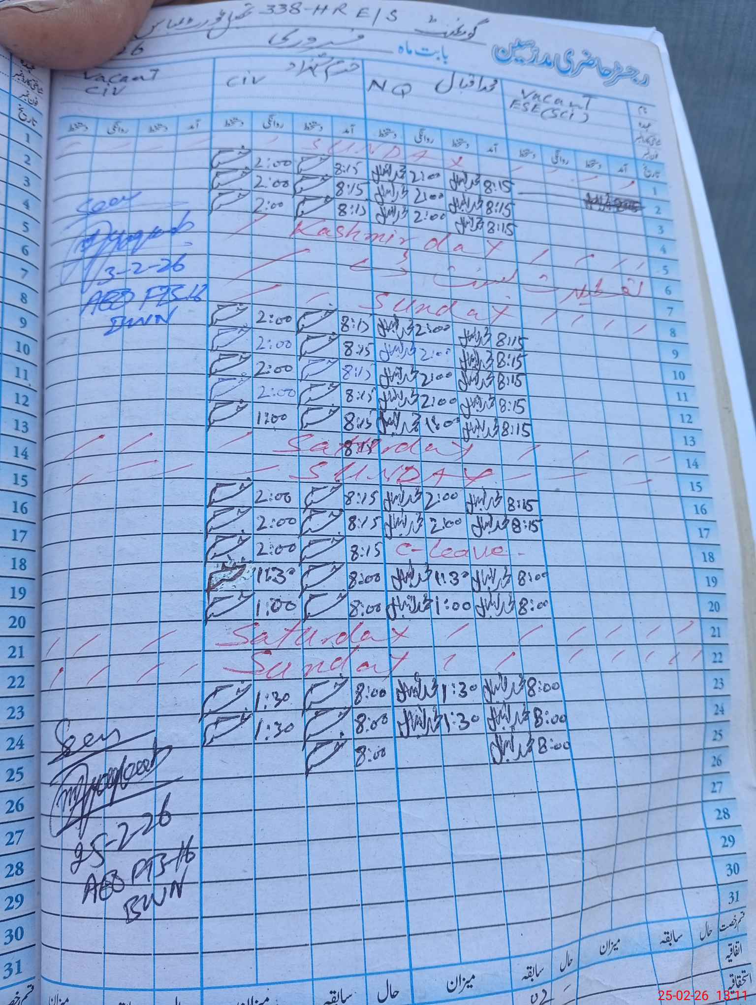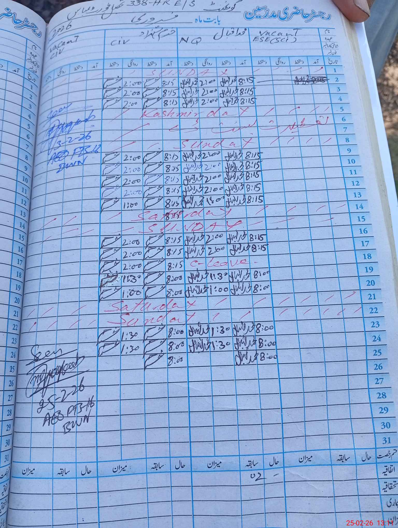 | CNIC | Full Name | Designation | R/C | Absence During Last Calender Month |