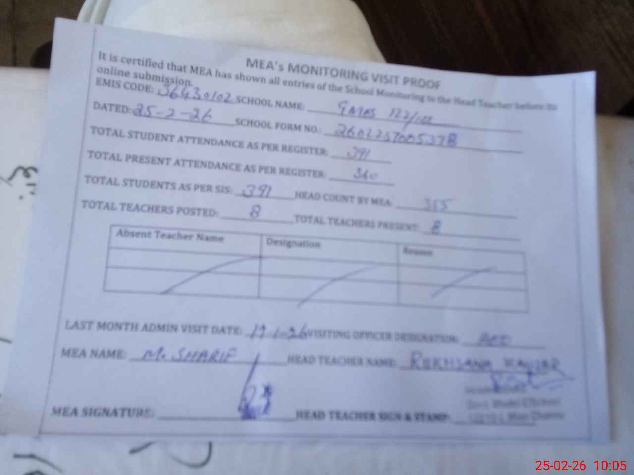 | Attendance Register | Head Teacher | MEA with School | Visit Proof |