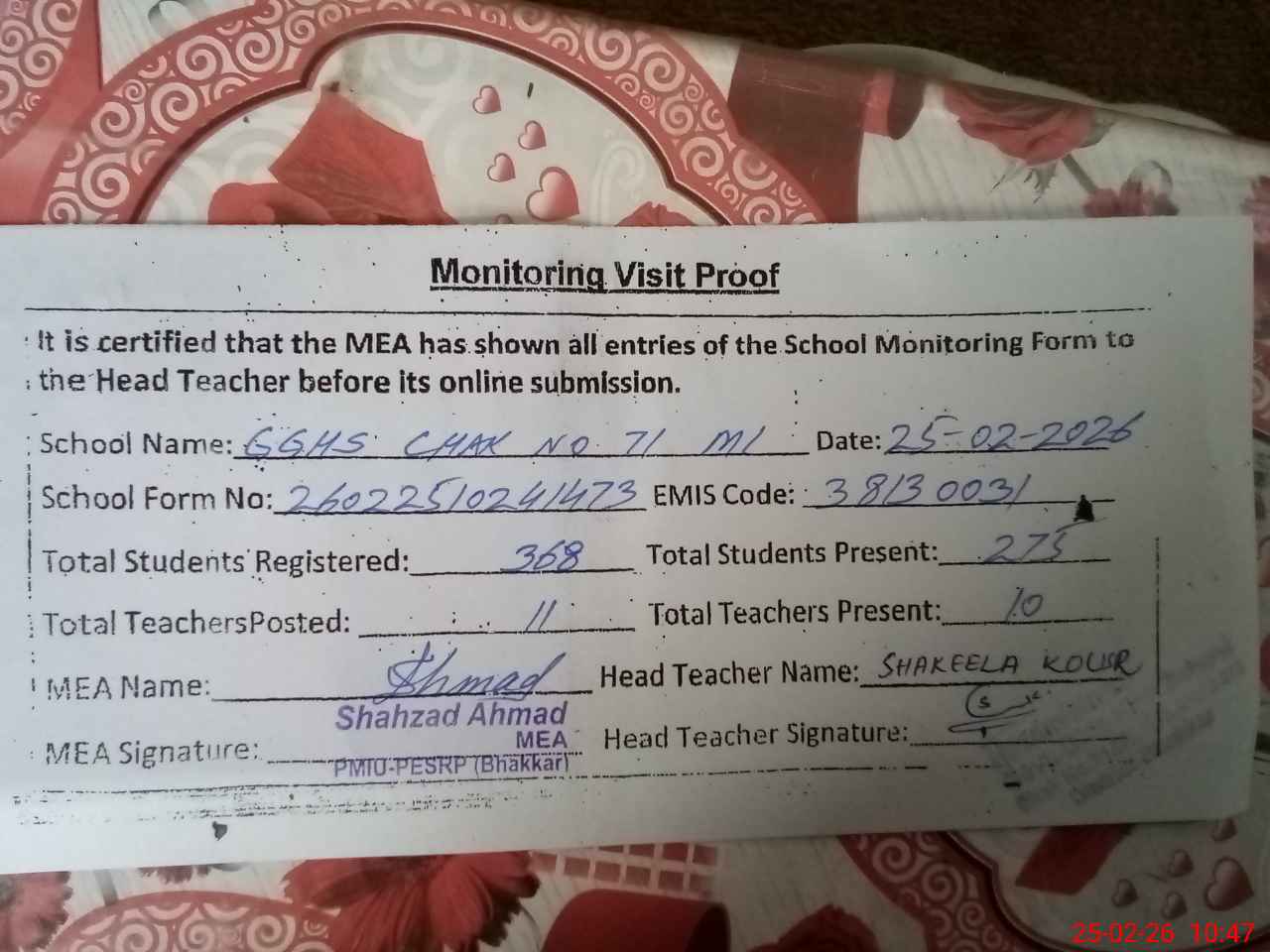 | EMIS Code: 38130031 | Name of School: GGHS CHAK NO 71 ML | |||