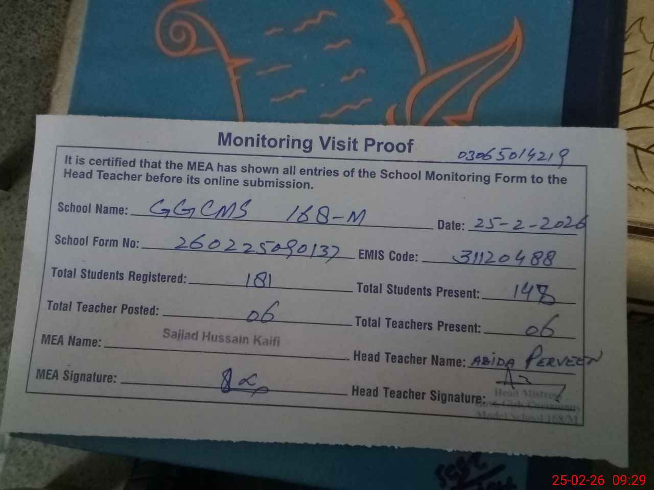 | EMIS Code: 31120488 | Name of School: GGCMS CHAK NO 168/MR MURAD | |||