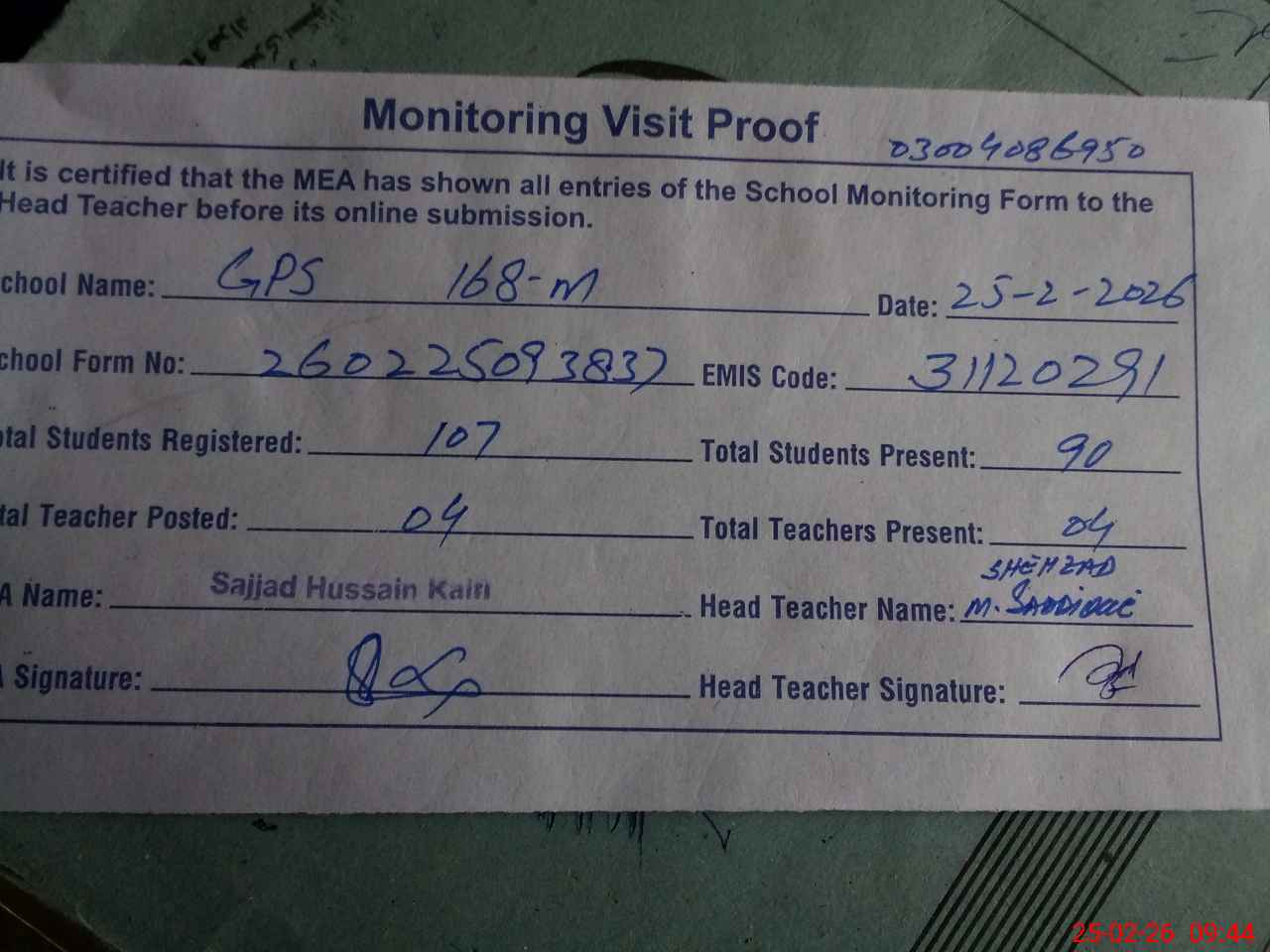 | EMIS Code: 31120291 | Name of School: GPS CHAK NO 168/M | |||