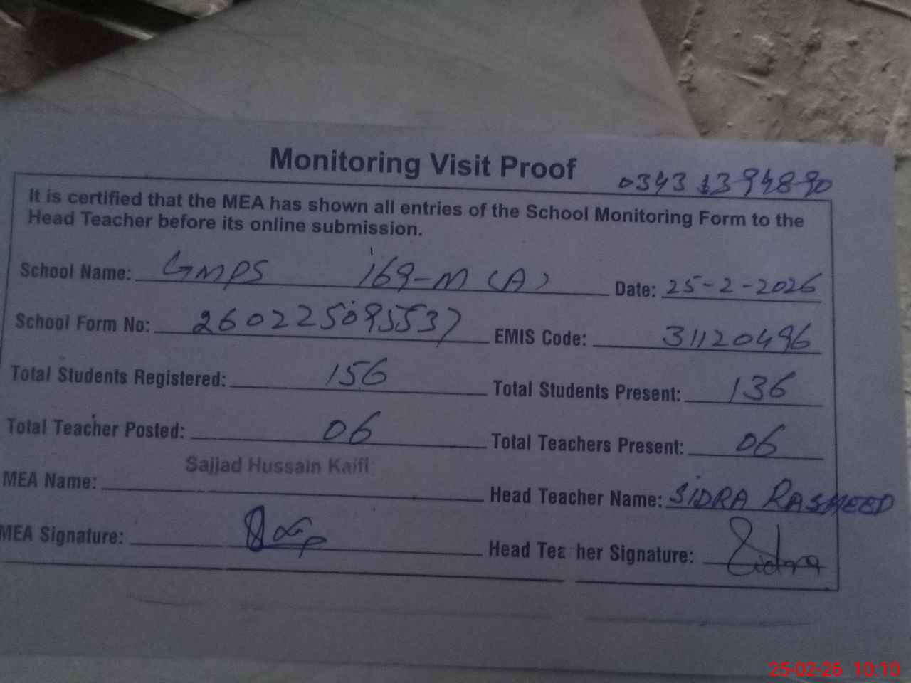| Attendance Register | Head Teacher | MEA with School | Visit Proof |