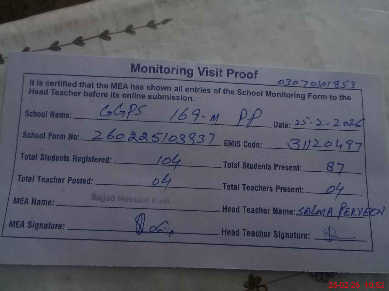| Attendance Register | Head Teacher | MEA with School | Visit Proof |