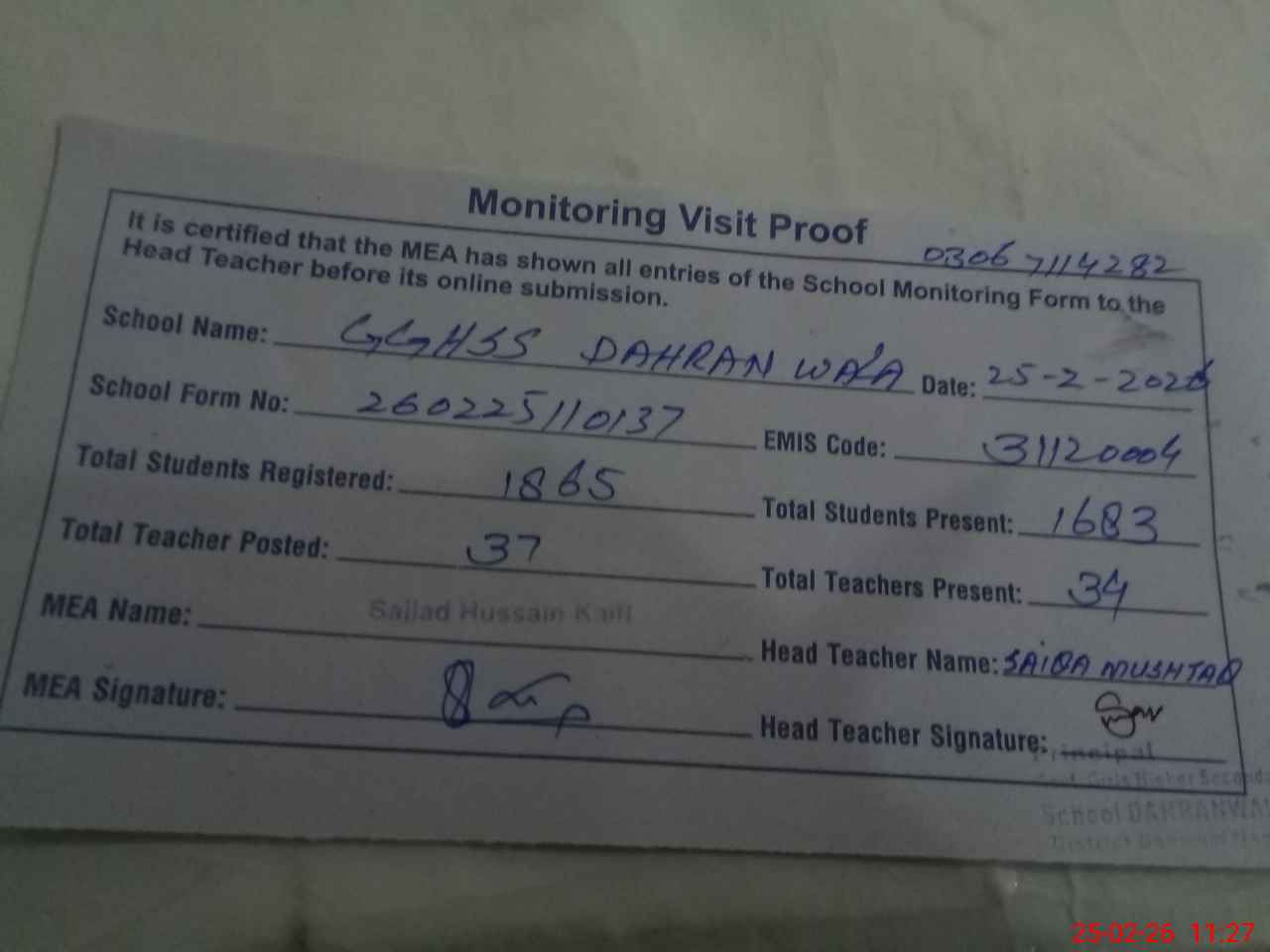 | EMIS Code: 31120004 | Name of School: GGHSS DAHRAN WALA | |||