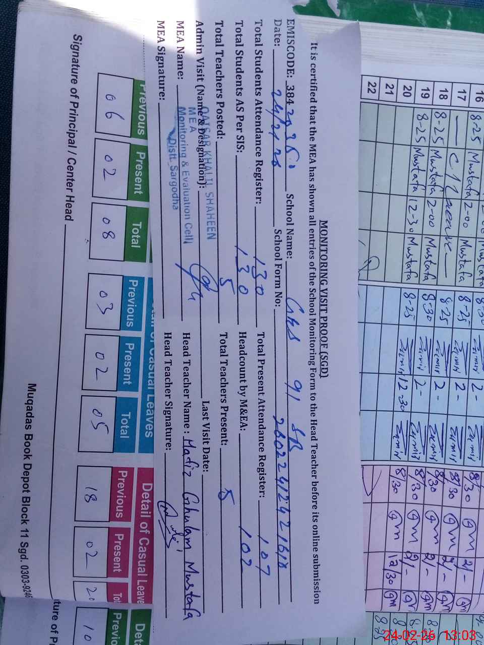 | Attendance Register | Head Teacher | MEA with School | Visit Proof |