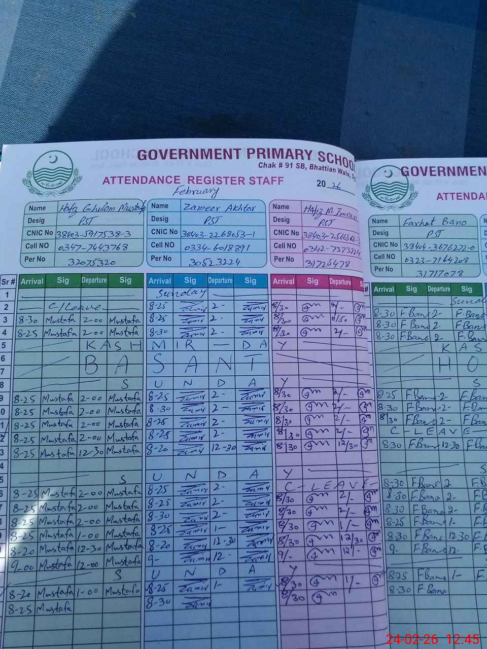 | CNIC | Full Name | Designation | R/C | Absence During Last Calender Month |