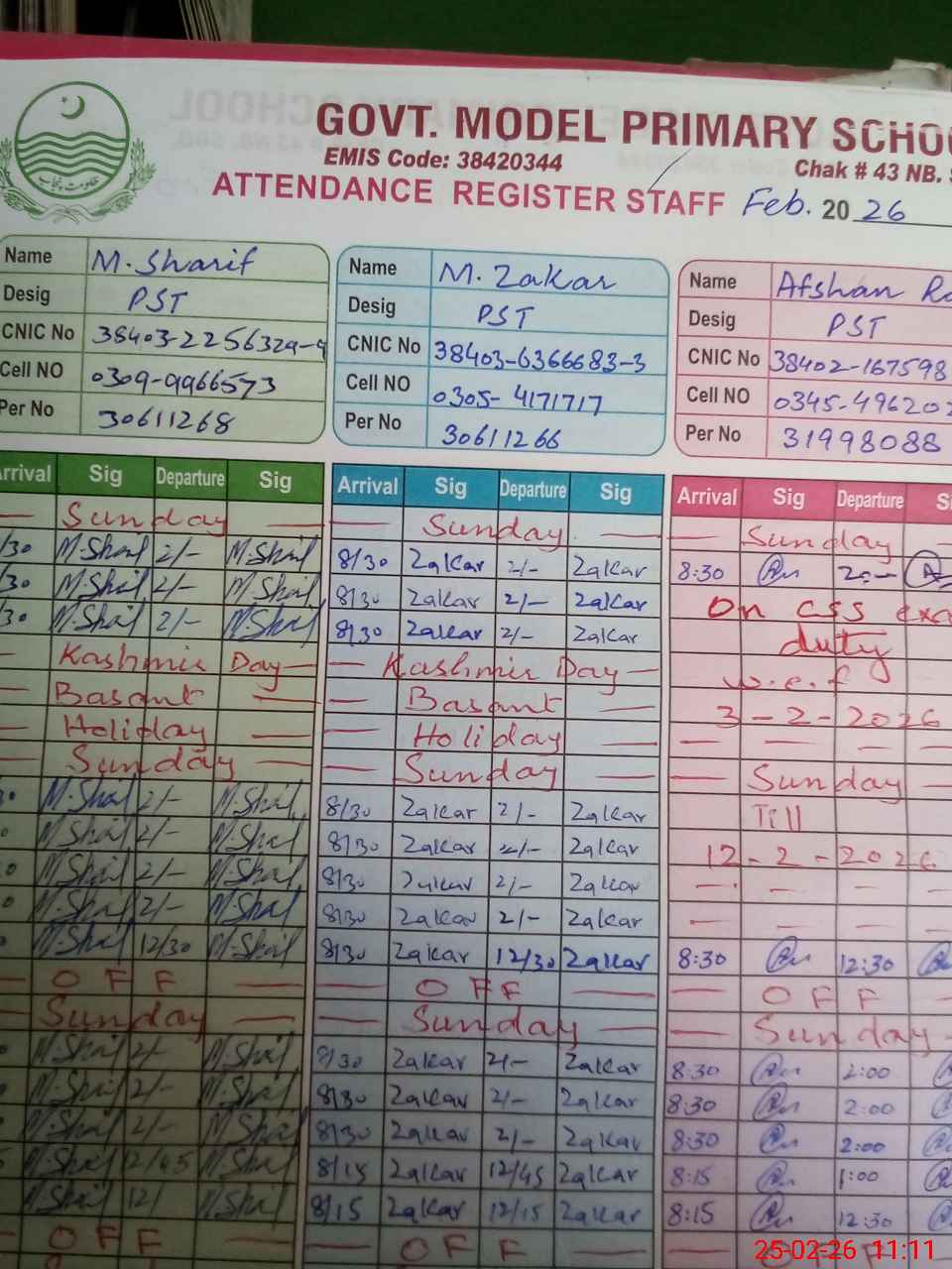 | CNIC | Full Name | Designation | R/C | Absence during last cal. month |