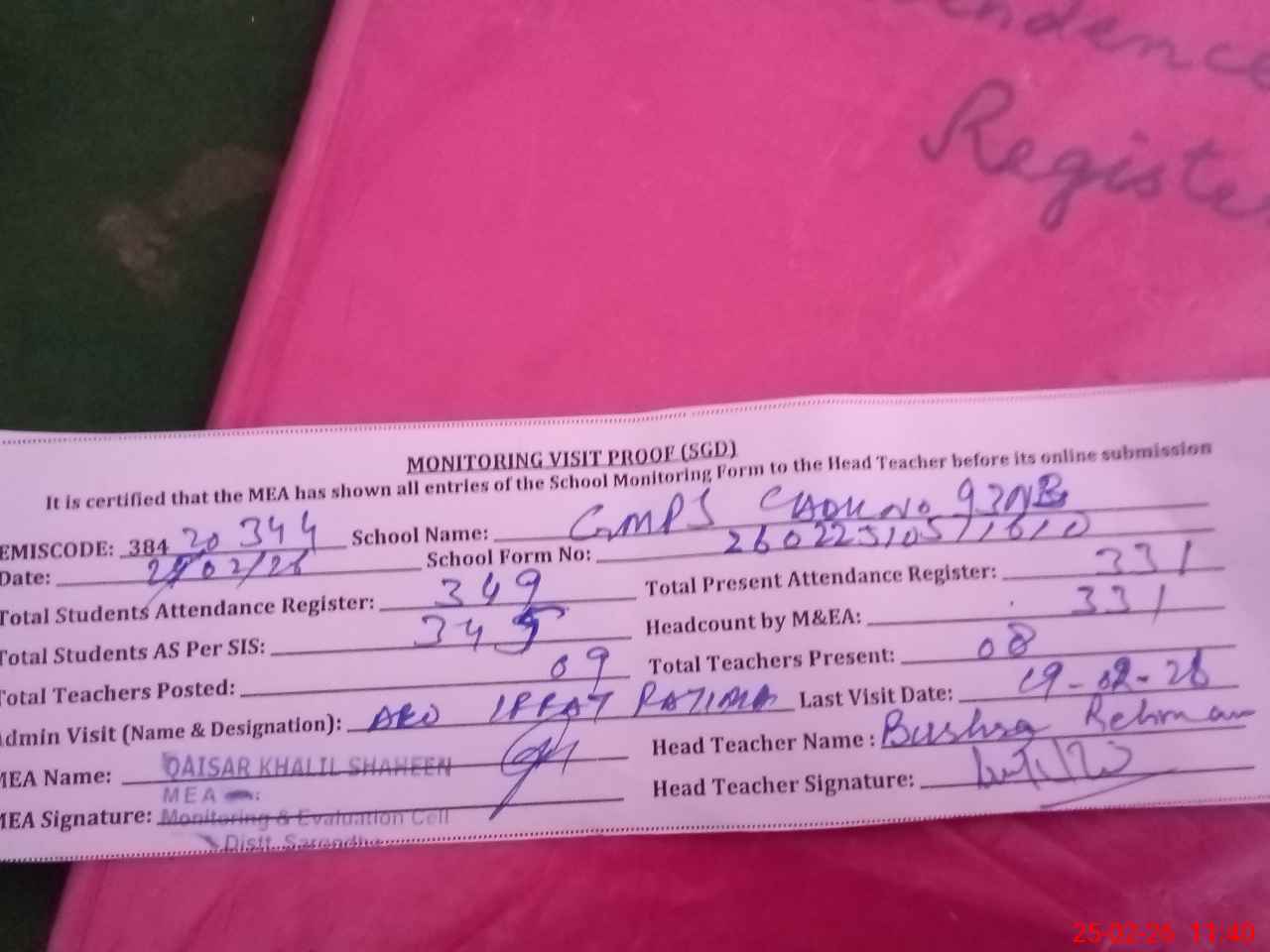| Attendance Register | Head Teacher | MEA with School | Visit Proof |