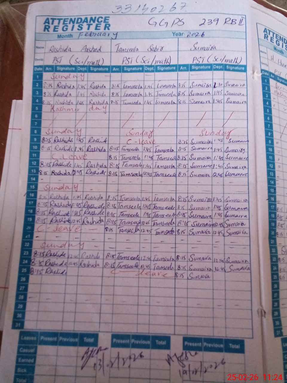 | CNIC | Full Name | Designation | R/C | Absence During Last Calender Month |