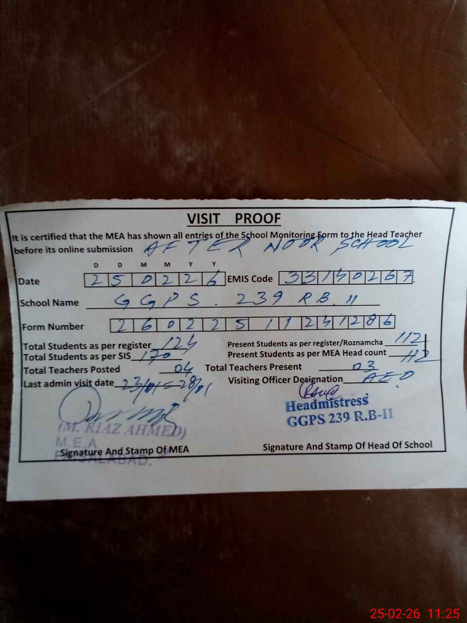 | Attendance Register | Head Teacher | MEA with School | Visit Proof |
