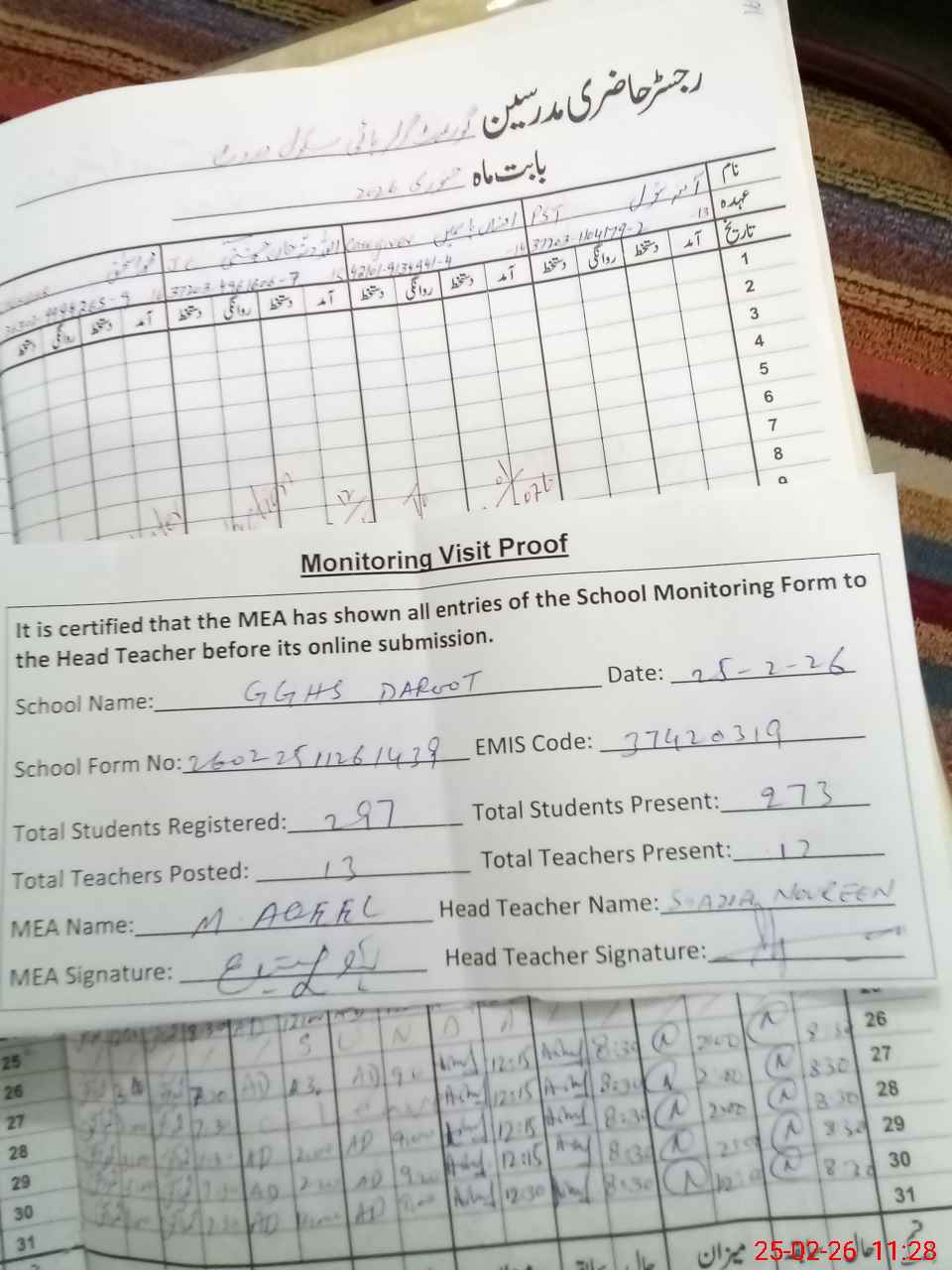 | Attendance Register | Head Teacher | MEA with School | Visit Proof |