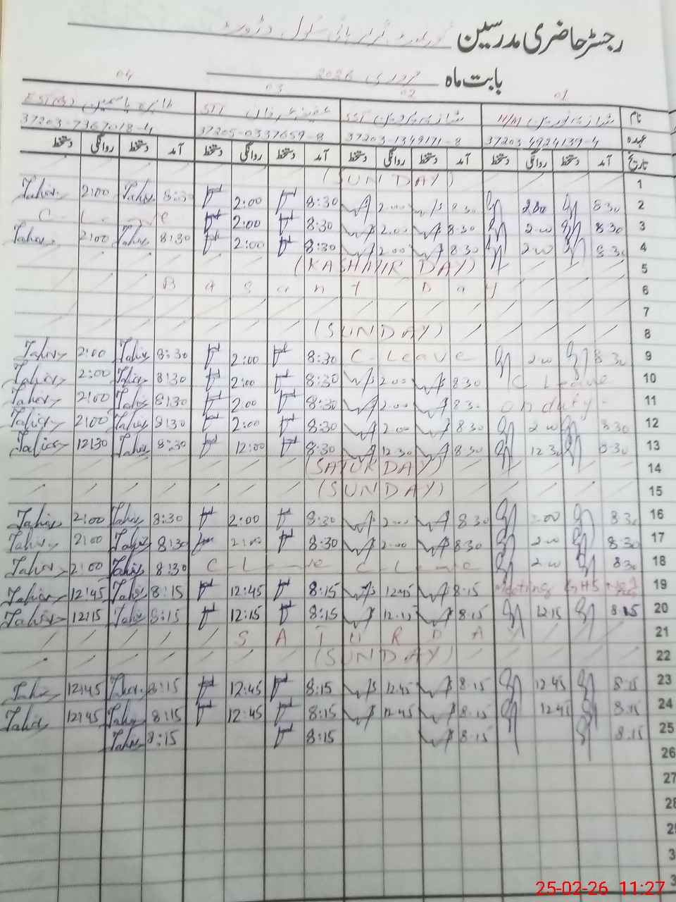 | CNIC | Full Name | Designation | R/C | Absence During Last Calender Month |
