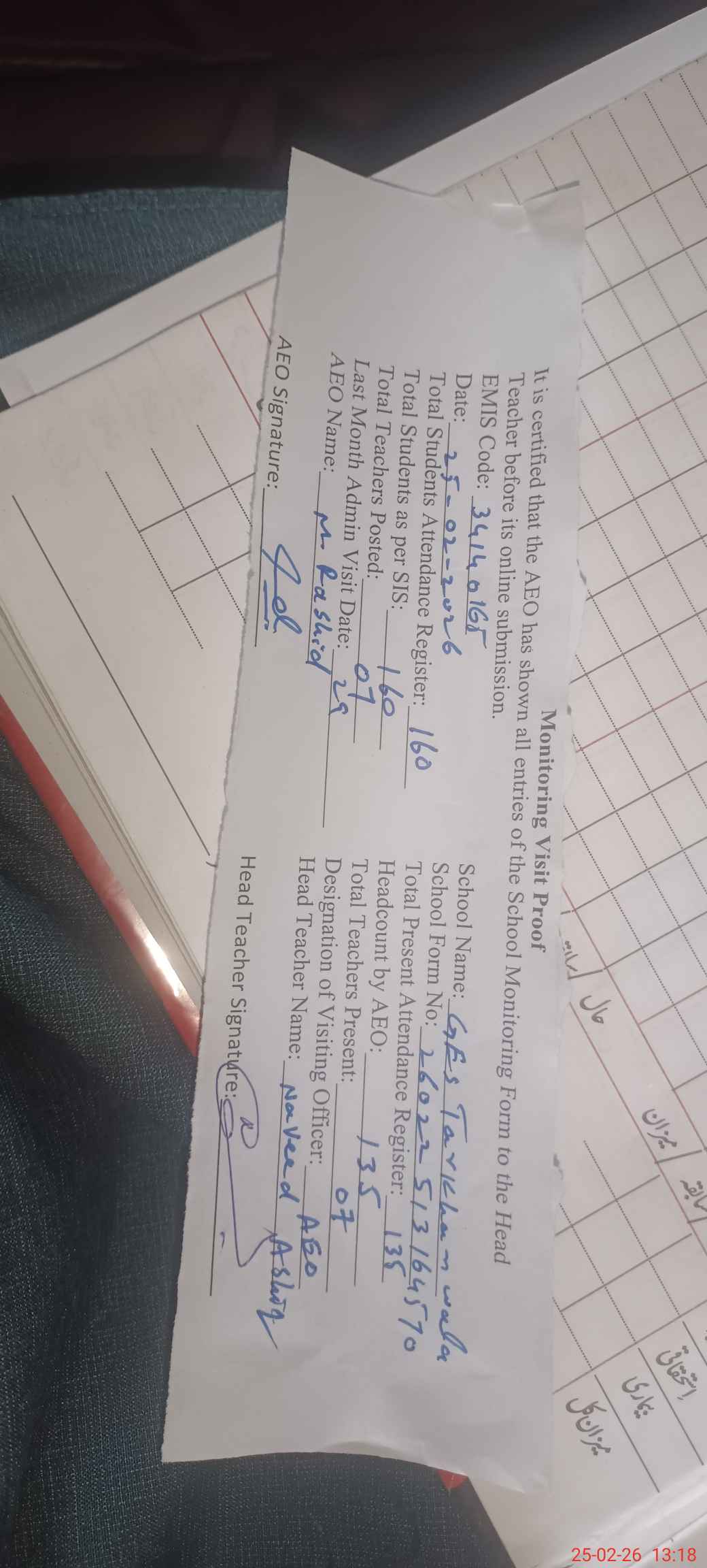 | EMIS Code: 34140165 | Name of School: GES TARKHANA WALA | |||