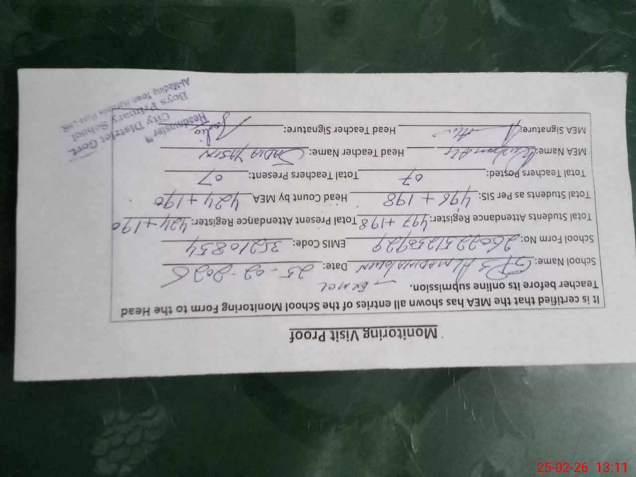 | Certified that this School was Inspected by the Undersigned MEA/DMO Today and the Information Stated Above is as Per Record. | |||||