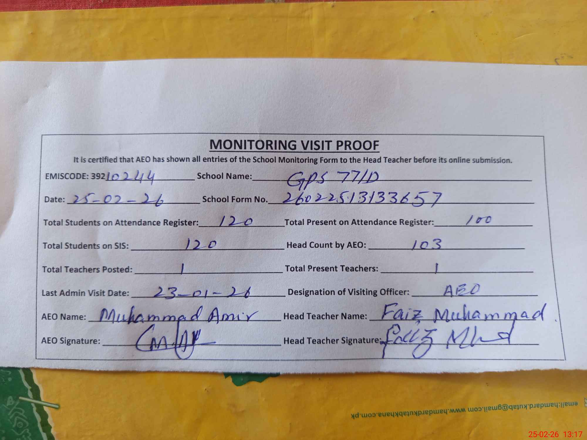 | Attendance Register | Head Teacher | MEA with School | Visit Proof |