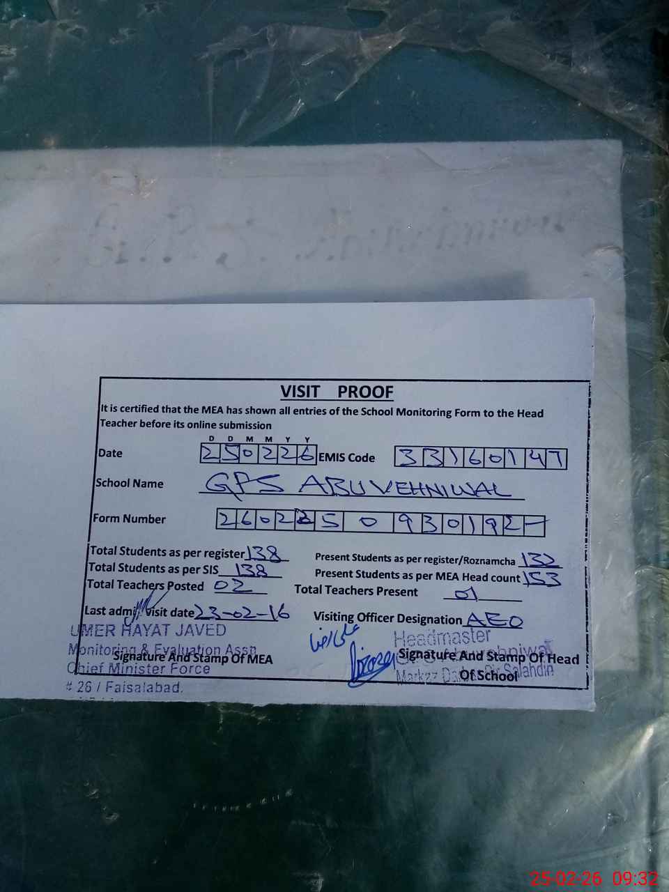 | Attendance Register | Head Teacher | MEA with School | Visit Proof |