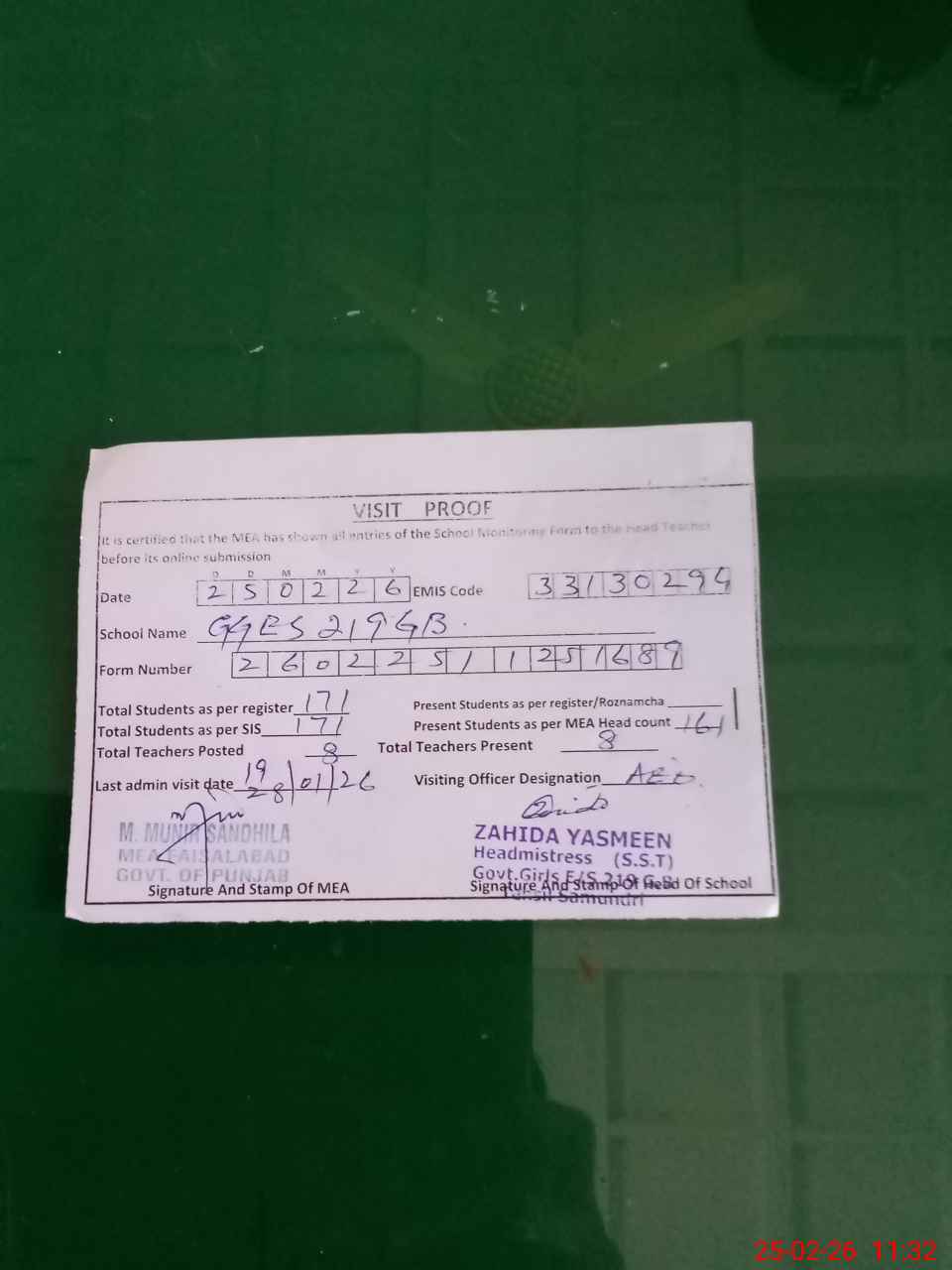 | EMIS Code: 33130294 | Name of School: GGES CHAK NO 219 GB | |||