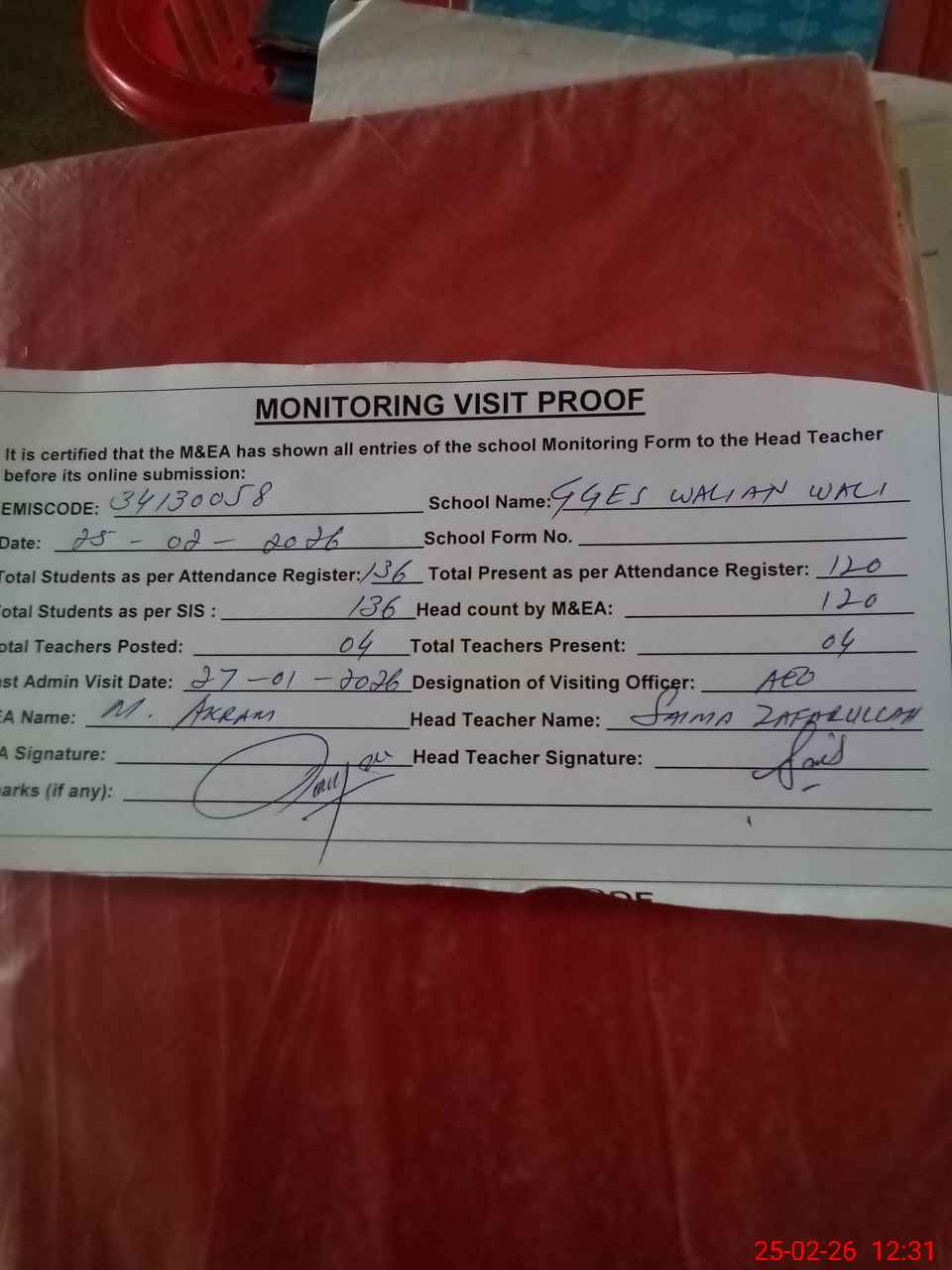 | Attendance Register | Head Teacher | MEA with School | Visit Proof |
