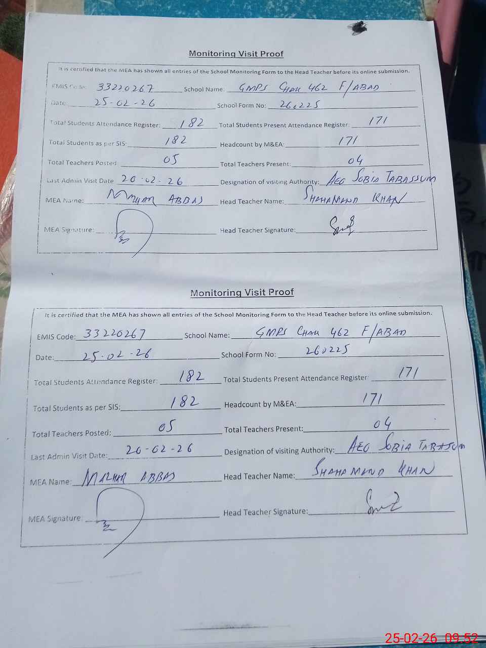 | EMIS Code: 33220267 | Name of School: GMPS CHAK NO. 462 JB ABADI FAROOQUE ABAD | |||