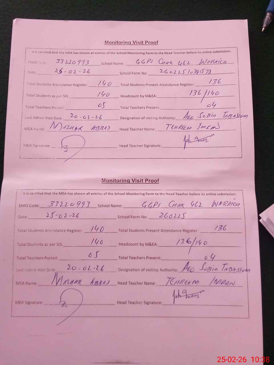 | EMIS Code: 33220993 | Name of School: GGPS CHAK 462 WARACH | |||