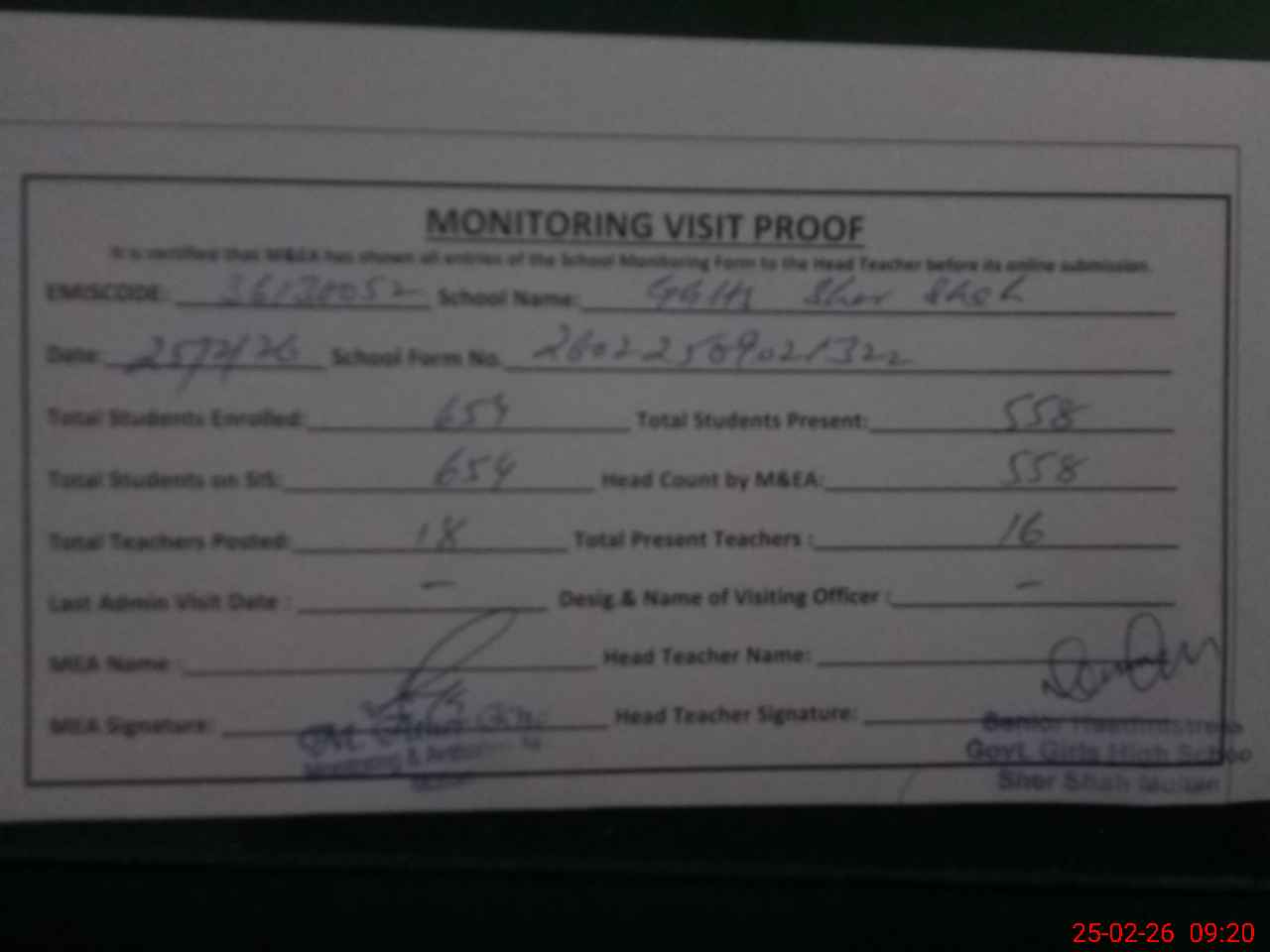 | Attendance Register | Head Teacher | MEA with School | Visit Proof |
