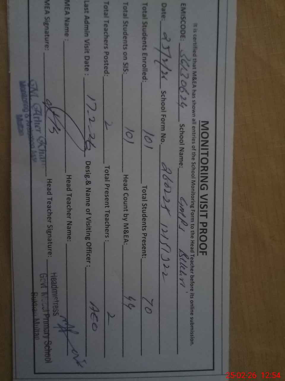 | Certified that this School was Inspected by the Undersigned MEA/DMO Today and the Information Stated Above is as Per Record. | |||||