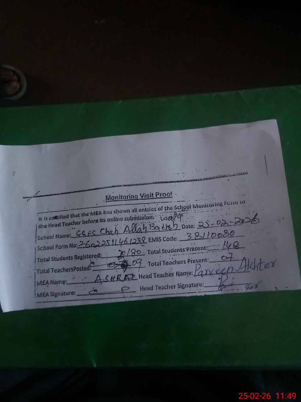 | Attendance Register | Head Teacher | MEA with School | Visit Proof |