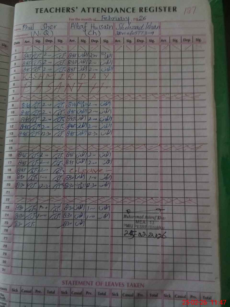 | 38**** | Iq**** Gh**** Ba**** | PST Arts | Regular | 0 | 0 | 0 | 0 | 0 | 0 | 0 | 0 | 0 | Absent (Un-Authorized) |