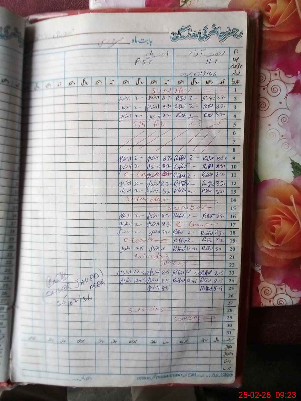 | CNIC | Full Name | Designation | R/C | Absence During Last Calender Month |