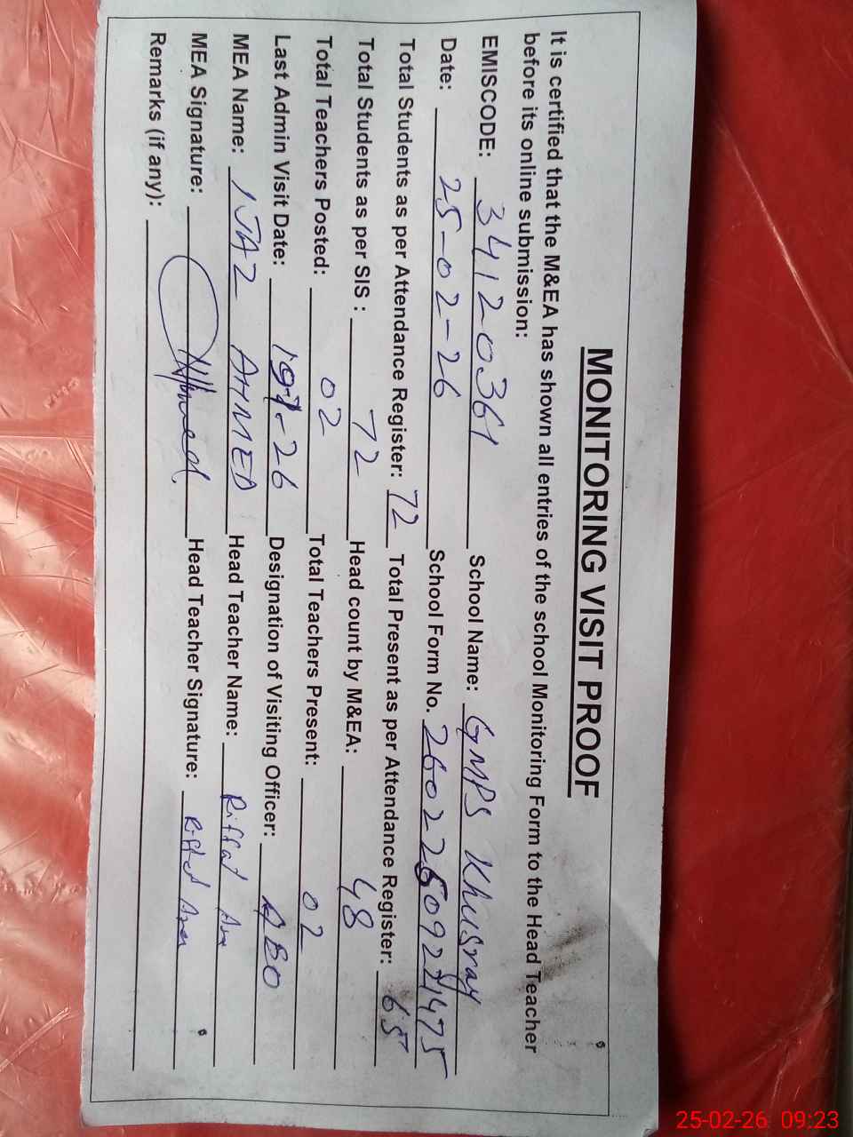 | Attendance Register | Head Teacher | MEA with School | Visit Proof |