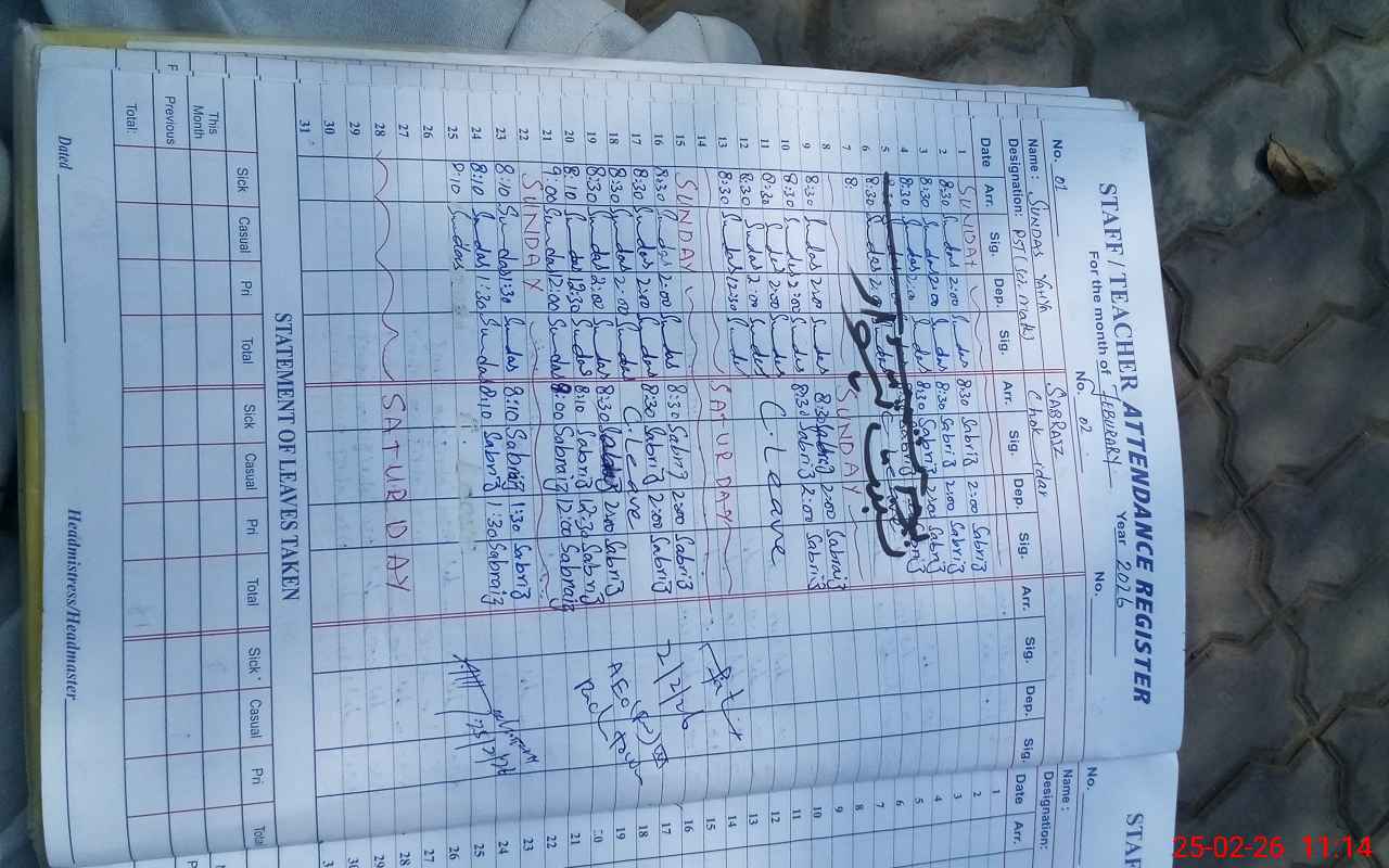 | CNIC | Full Name | Designation | R/C | Absence During Last Calender Month |