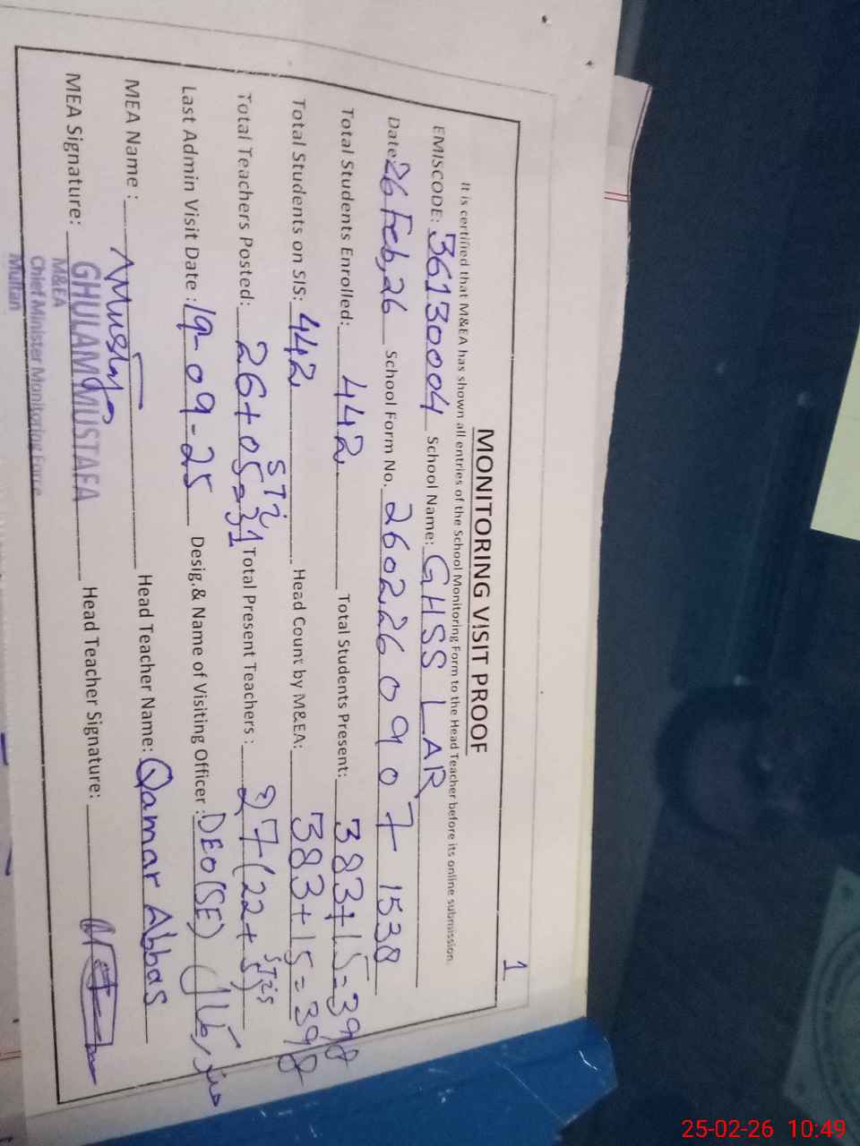 | Certified that this School was Inspected by the Undersigned MEA/DMO Today and the Information Stated Above is as Per Record. | |||||