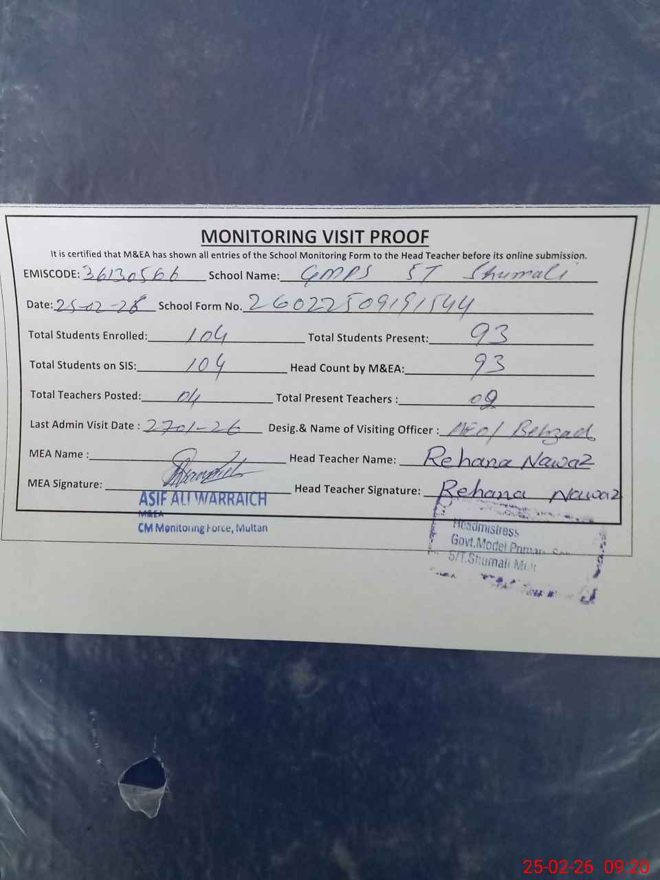 | Attendance Register | Head Teacher | MEA with School | Visit Proof |