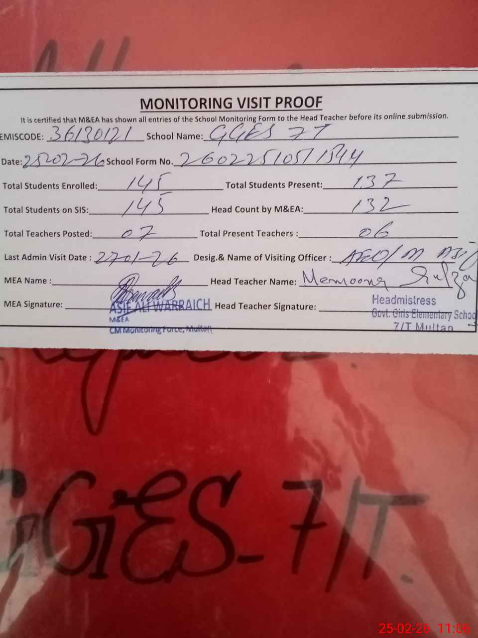 | Attendance Register | Head Teacher | MEA with School | Visit Proof |